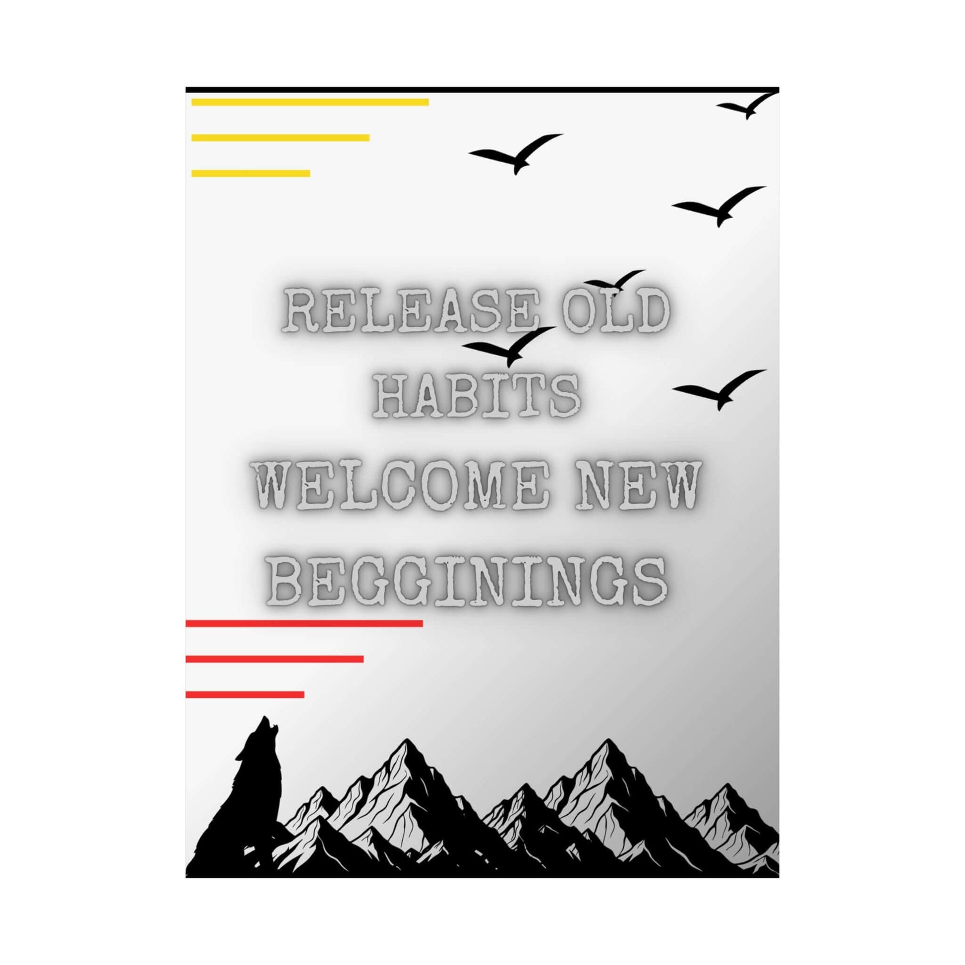 This matte vertical poster captures quiet momentum — a lone wolf silhouette beneath jagged mountains, birds taking flight, and a softened message pushing forward: “Release old habits / Welcome new beginnings.” The misty, desaturated background and subtle neon line accents give it a modern, contemplative edge. Hung in a bedroom, studio, or entryway, it reads like a personal reminder to let go and step into change, fitting spaces where reflection and small rituals matter.
